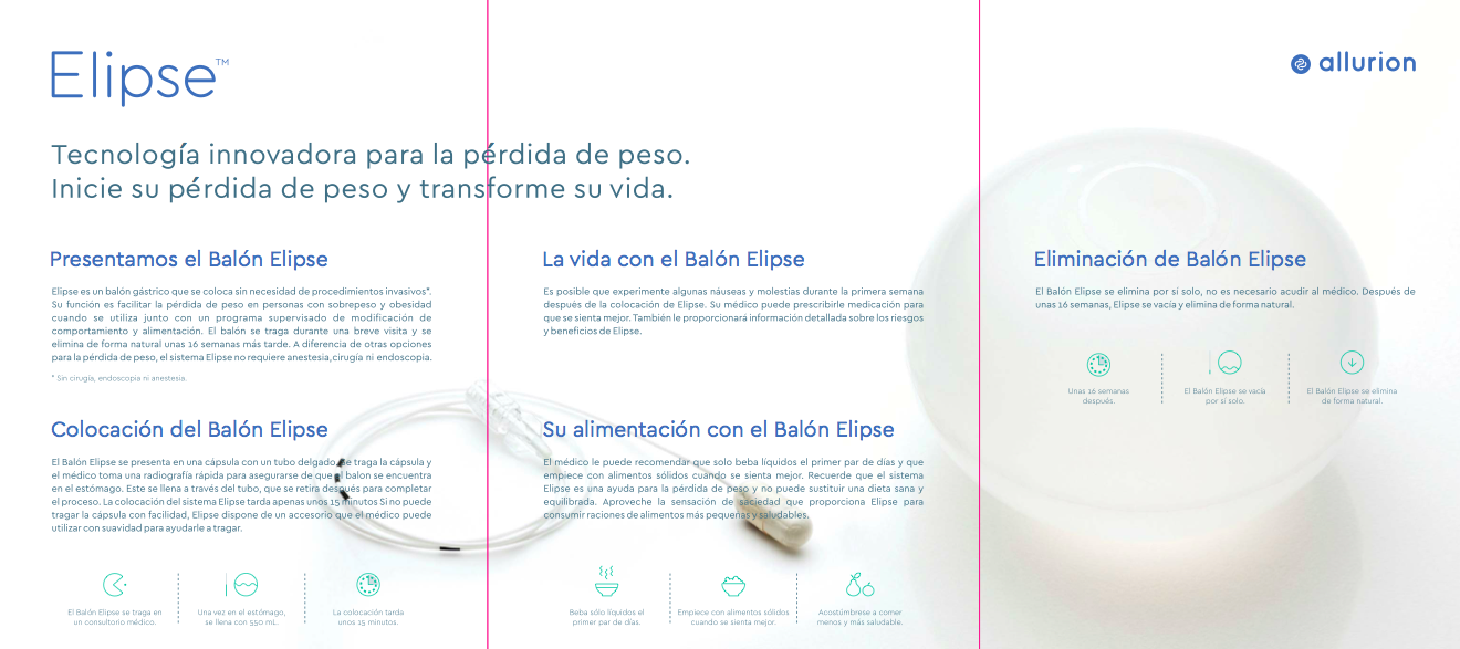 El producto estrella de Allurion -el Globo Elipse- es un globo gástrico sin procedimiento ™. El globo Elipse llena el estómago y le ayuda a sentirse lleno y por tanto a comer menos, y sentirse más saciado. El globo Elipse se traga por vía oral durante una breve visita médica y - meses después - se elimina.
